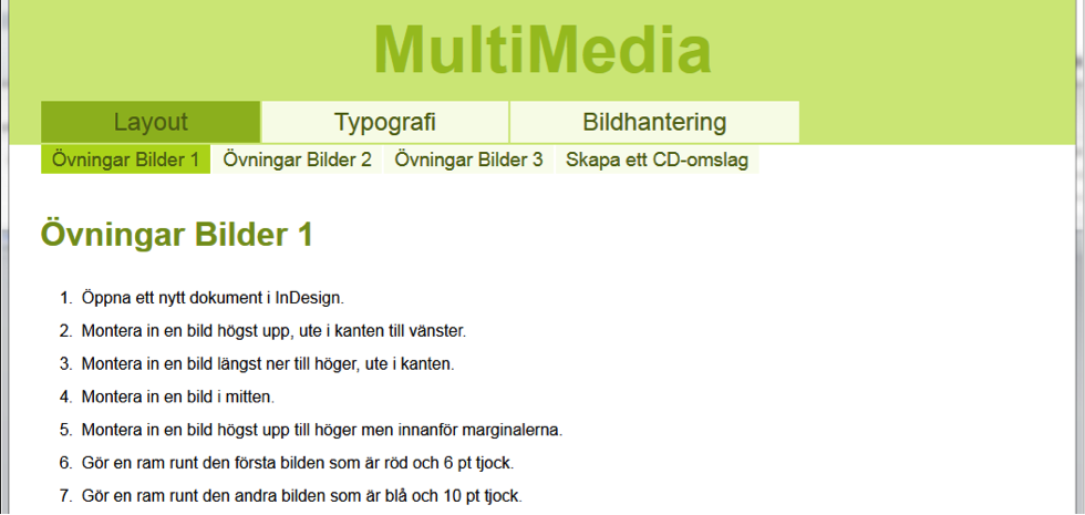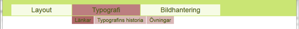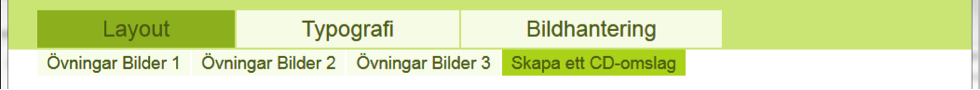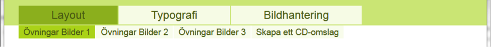 Det finns tre huvudflikar som innehåller de övergripande delarna av kursen. De är Layout, Typografi och Bildhantering.